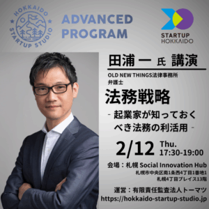 今回、本プログラムの一環として、田浦 一 氏(OLD NEW THINGS法律事務所/弁護士)による講演会(コミュニティイベント)を開催いたします。